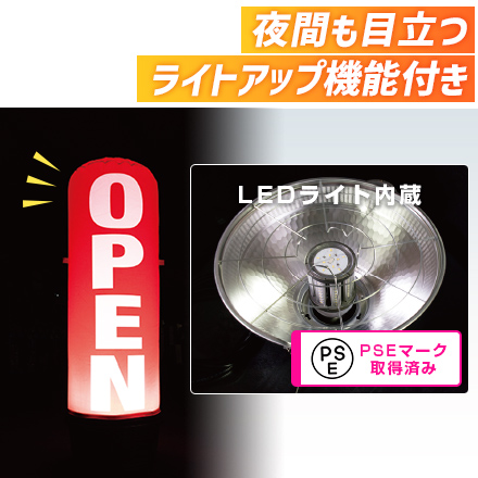 「エアー看板(2mタイプ)」は、人より少し大きい全長約2mで、存在感のあるエアー看板。バルーンに空気を送り続けることで自立し、アイキャッチ力抜群の看板として活躍します。ライトアップ機能付きで夜間も目立つので、野外フェスや物産展、フードショーなどの呼び込みにもお薦め。メディアの装着や収納も楽々で扱いやすい商品に、格安名入れ制作を承ります。